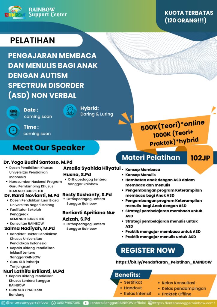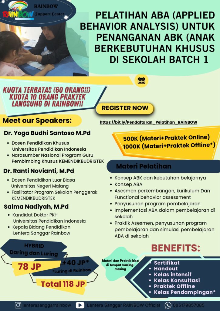Rainbow Support Center telah melaksanakan Pelatihan Applied Behavior Analysis (ABA) hingga Batch ke-2, sebagai upaya menjawab kebutuhan guru dan tenaga pendidik dalam menghadapi tantangan perilaku anak berkebutuhan khusus, terutama anak dengan Autism Spectrum Disorder (ASD), baik di sekolah reguler maupun di Sekolah Luar Biasa (SLB).