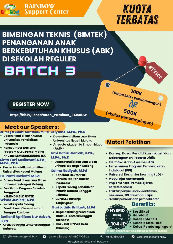 Rainbow Support Center telah sukses menyelenggarakan Bimbingan Teknis (BIMTEK) Penanganan Anak Berkebutuhan Khusus (ABK) hingga Batch ke-3 sebagai respon atas semakin meningkatnya kebutuhan guru di sekolah reguler yang kini mulai menerima siswa ABK dalam proses inklusi pendidikan.
