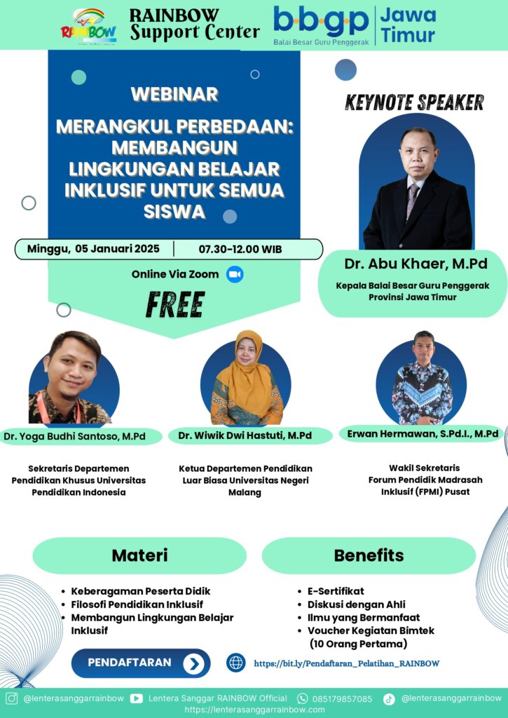 Webinar ini menjadi ruang reflektif dan inspiratif bagi para pendidik yang ingin menciptakan kelas yang ramah bagi semua anak — tanpa terkecuali. Diselenggarakan oleh Rainbow Support Center, kegiatan ini mengajak peserta memahami makna inklusi yang sesungguhnya: bukan sekadar menerima perbedaan, tapi merangkulnya sebagai kekuatan bersama.