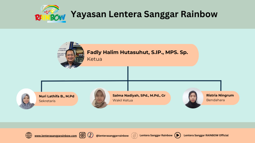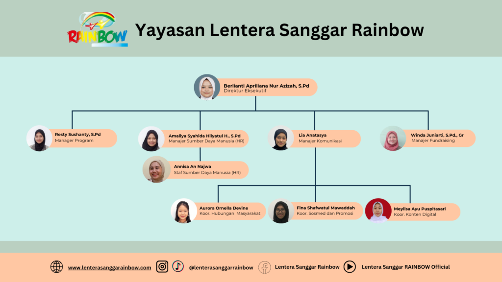 Dewan Pengurus Yayasan Lentera Sanggar Rainbow periode 2025–2028 terdiri dari Ketua, Wakil Ketua, Sekretaris, dan Bendahara. Mereka bertanggung jawab memimpin arah strategis organisasi, mengelola administrasi dan keuangan, serta memastikan jalannya program-program besar secara efektif dan terukur. Kolaborasi erat di tingkat pengurus ini menjadi fondasi kokoh bagi kerja organisasi secara keseluruhan.