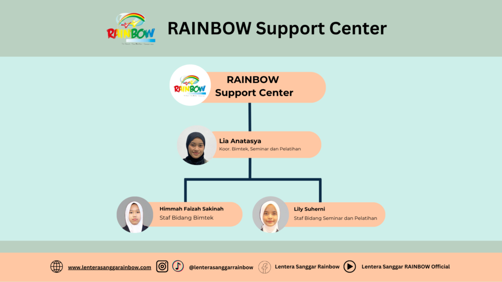 RAINBOW Support Center merupakan unit yang menyelenggarakan bimbingan teknis, seminar, dan pelatihan untuk guru, tenaga pendidik, dan masyarakat umum. Dengan koordinasi yang sistematis dan materi yang relevan, pusat ini bertujuan membangun kapasitas dan pemahaman tentang pendidikan inklusif dan pendekatan berbasis kebutuhan khusus.