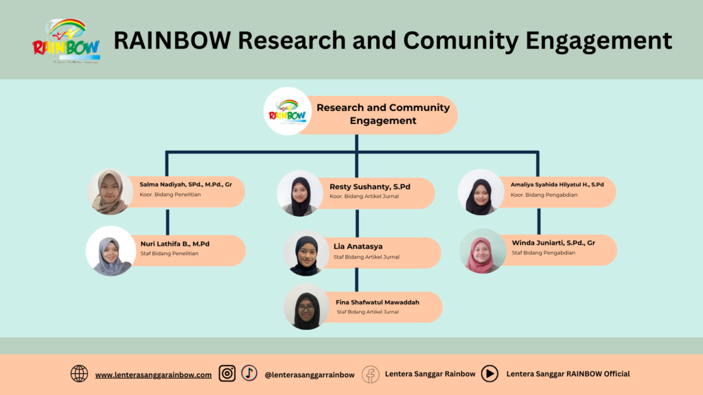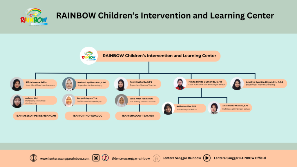 RAINBOW Children’s Intervention and Learning Center merupakan unit layanan yang menangani intervensi langsung kepada anak-anak dengan kebutuhan khusus. Terdiri dari tim asesmen, shadow teacher, orthopedagog, serta tim kurikulum dan bimbingan belajar, divisi ini bekerja berdasarkan hasil identifikasi dan asesmen perkembangan. Pelayanan dirancang secara individual dan terintegrasi demi mendukung tumbuh kembang anak secara optimal.
